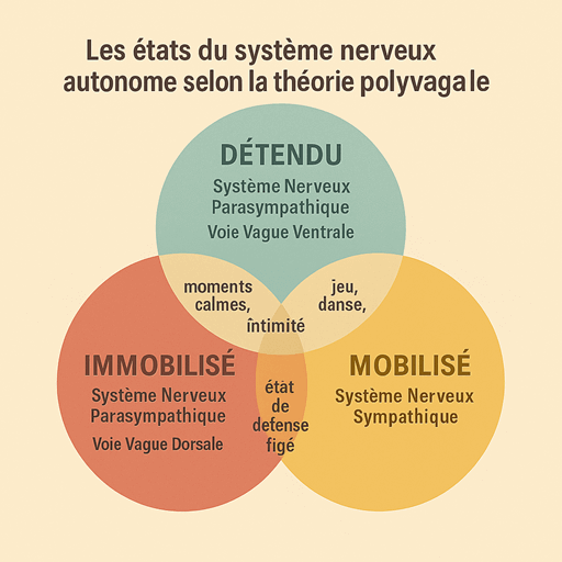 La théorie polyvagale (TPV), formulée par Stephen Porges dans les années 1990, décrit une hiérarchie des réponses du système nerveux autonome : sécurité (vagal ventral), mobilisation (sympathique) et immobilisation (vagal dorsal), activées par une détection inconsciente du danger appelée neuroception, et souligne que le retour à la sécurité passe avant tout par la corégulation.